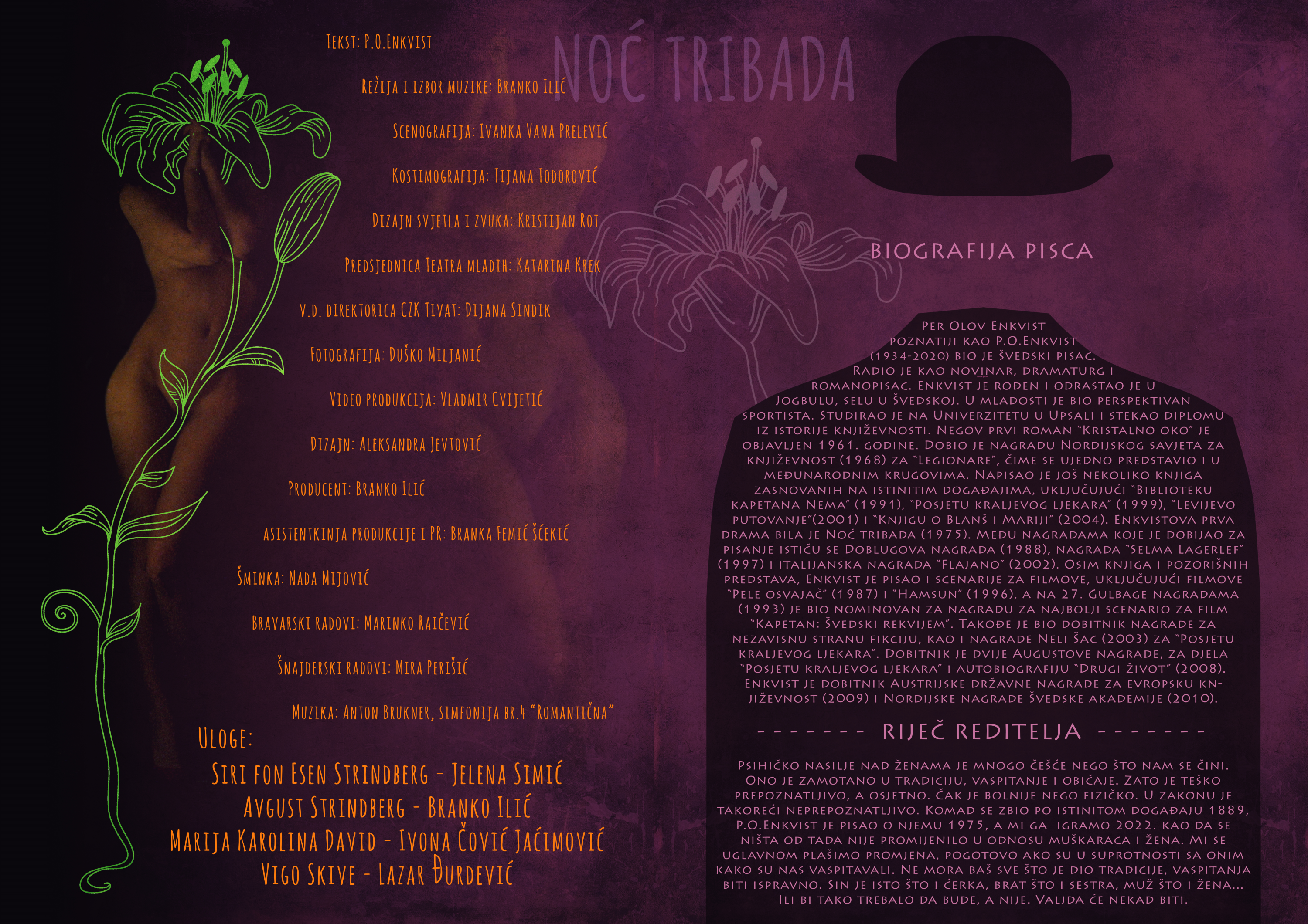 Psihičko nasilje nad ženama je mnogo češće nego što nam se čini. Ono je zamotano u tradiciju, vaspitanje i običaje. Zato je teško prepoznatljivo, a osjetno. Čak je bolnije nego fizičko. U zakonu je takoreći neprepoznatljivo. Komad se zbio po istinitom događaju 1889, P.O.Enkvist je pisao o njemu 1975, a mi ga igramo 2022. kao da se ništa od tada nije promijenilo u odnosu muškaraca i žena. Mi se uglavnom plašimo promjena, pogotovo ako su u suprotnosti sa onim kako su nas vaspitavali. Ne mora baš sve što je dio tradicije, vaspitanja biti ispravno. Sin je isto što i ćerka, brat što i sestra, muž što i žena… Ili bi tako trebalo da bude, a nije. Valjda će nekad biti.